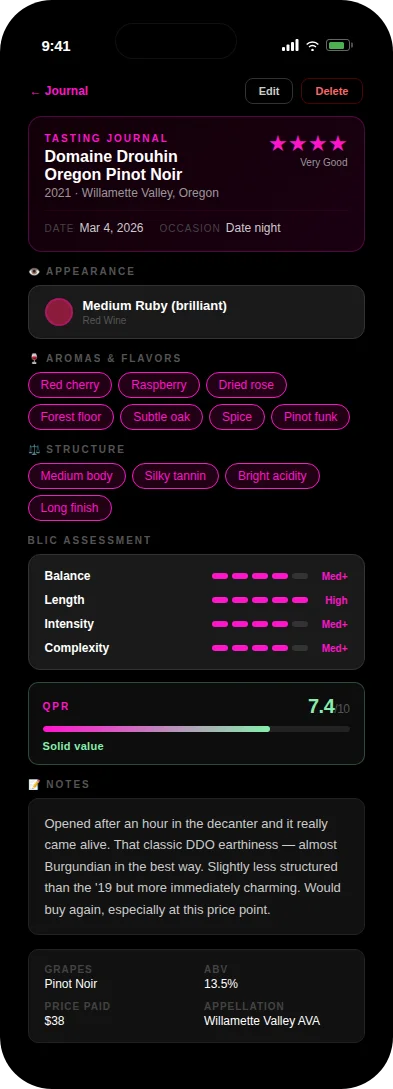 Log every wine you taste. Structured tasting chips, BLIC scoring, QPR (quality-price ratio) tracking, and label photos. Your wine memory, organized.